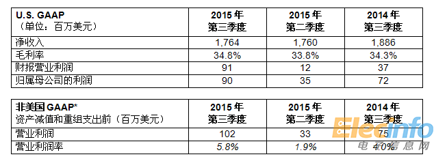 2015年第三季度,凈收入總計(jì)17.6億美元,毛利率為34.8%,扣除減值重組支出,營業(yè)利潤率為5.8%,凈利潤9000萬美元,自由現(xiàn)金流為正8500萬美元。