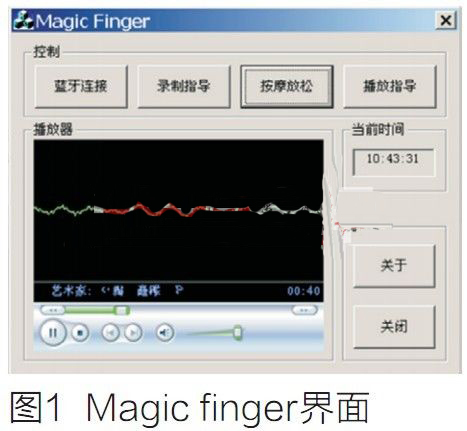 “中醫(yī)神指”產品主要由主控軟件Magic finger ,藍牙無線發(fā)送器,以及藍牙終端三部分組成,其中主控軟件Magic finger界面如圖1所示,包括藍牙連接、錄制指導、按摩放松、播放指導等按鈕。藍牙連接控制藍牙適配器和神指上的藍牙模塊進行連接和配對,錄制指導用于錄制醫(yī)生的指導建議并保存成相應的音頻文件,便于藍牙傳輸。播放指導調用錄制醫(yī)生的指導建議對使用者進行相應醫(yī)療動作,按摩放松選擇醫(yī)生指定的輕松柔和的音樂,給予使用者音樂治療。