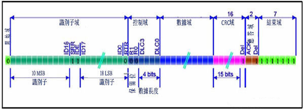 圖1為一個(gè)CAN數(shù)據(jù)封包的格式,可分為起始域、仲裁域、控制域、數(shù)據(jù)域、CRC域、應(yīng)答域和結(jié)束域。每個(gè)封包(Frame)最長可達(dá)128位,以下分別說明各域的意義,其它詳細(xì)資料可參考BOSCH公司的相關(guān)CAN Bus技術(shù)文件。