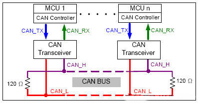 CAN Bus為利用一種雙線的差動(dòng)訊號(hào)傳輸規(guī)格,典型的CAN節(jié)點(diǎn)皆會(huì)由一個(gè)機(jī)械控制單元(Micro Controller Unit, MCU)來做控制,如圖2所示,MCU中CAN Controller透過CAN_TX與CAN_RX傳送/接收訊號(hào)至CAN Transceiver轉(zhuǎn)換成差動(dòng)訊號(hào)CAN_H與CAN_L。而終端電阻120歐姆能有效的吸收CAN網(wǎng)絡(luò)上的反射波,有效地增強(qiáng)信號(hào)。